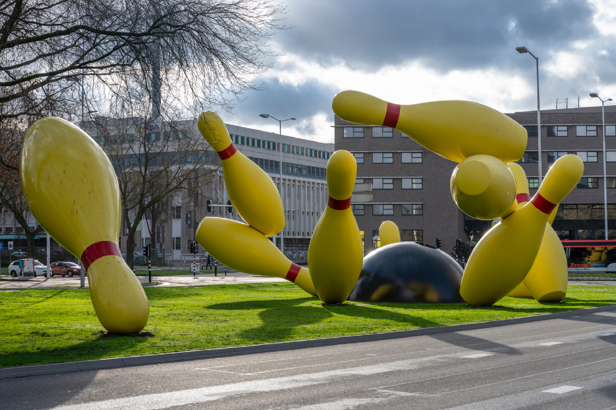 639 Artist : Oldenburg, Claes/van Bruggen, Coosje ; Title : Flying Pins ; Date : 2000 ; Material : Steel, fiber-reinforced plastic, polyvinyl chloride foam ; Dimensions : 37.5 m long × 20 m large (wide); dix quilles (ten pins), chacune (each): 7.5 m de haut (hight) × 2.3 m diamètre le plus large (widest diameter); boule (ball): 2.8 m de haut (high) × 6.7 m diamètre (diameter) ; Institution : Corner John F. Kennedylaan, Fellenoord, Eindhoven, Netherlands ; Photographer : Cox, Peter ; Date of photograph : 2020/02/25, 09:45 ; Photographic medium : Digital ; Camera : Nikon Z7 ; Source : Peter Cox ; Courtesy : Peter Cox ; Copyright : Peter Cox