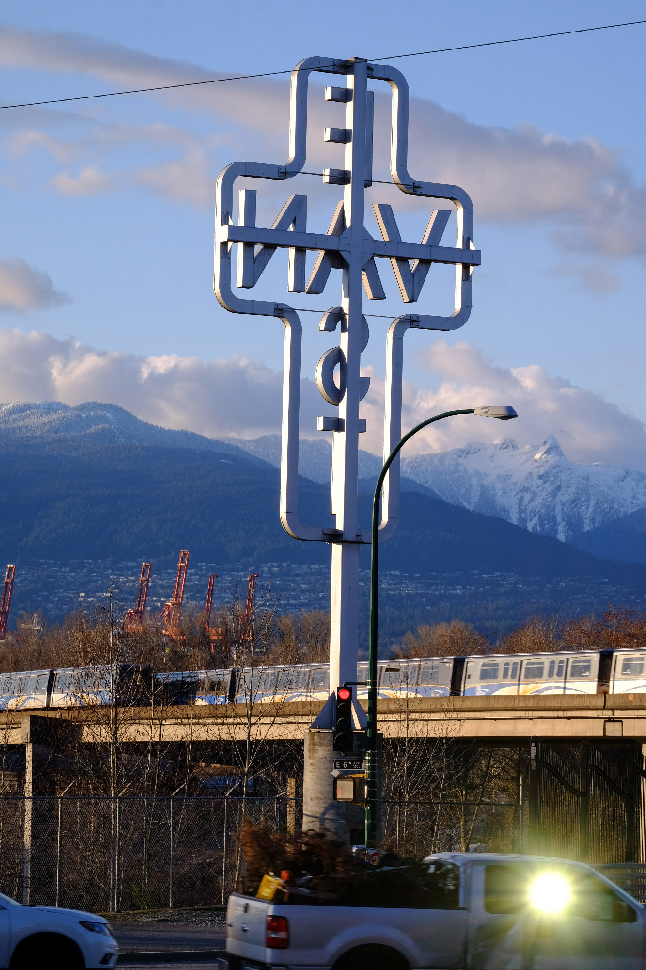 642 Artist : Lum, Ken ; Title : East Van Cross (The Monument for East Vancouver) ; Date : 2010 ; Material : Concrete, steel, aluminium, impact modified acrylic, LED illumination ; Dimensions : 17 m ; Institution : Corner of East 6th Avenue and Clark Drive, Vancouver, Canada ; Photographer : Dauncey, Byron ; Date of photograph : 2020/03/08 ; Source : Byron Dauncey ; Courtesy : Byron Dauncey ; Copyright : Byron Dauncey